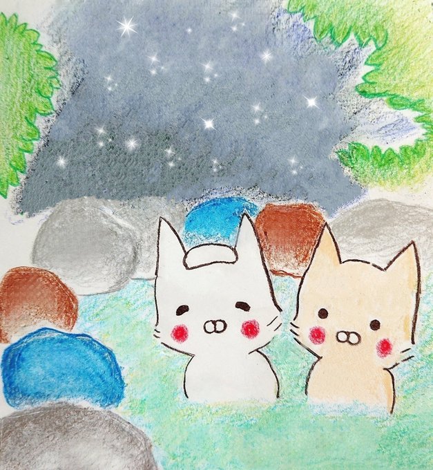 6月26日 今日は【露天風呂】の日♨️ 星空風呂•*¨*•.¸¸☆ 混浴らしいです(笑) line.me/S/shop/sticker… #シュクル #LINEスタンプ #ラインスタンプ #アナログ #色鉛筆 #アナログイラスト #ゆるキャラ #今日は何の日 #露天風呂 #露天風呂の日 #ねこ #猫 #ネコ #絵 #風呂の日