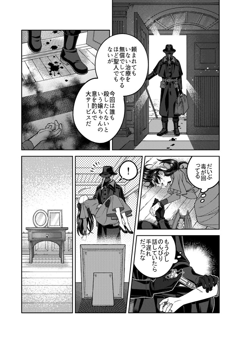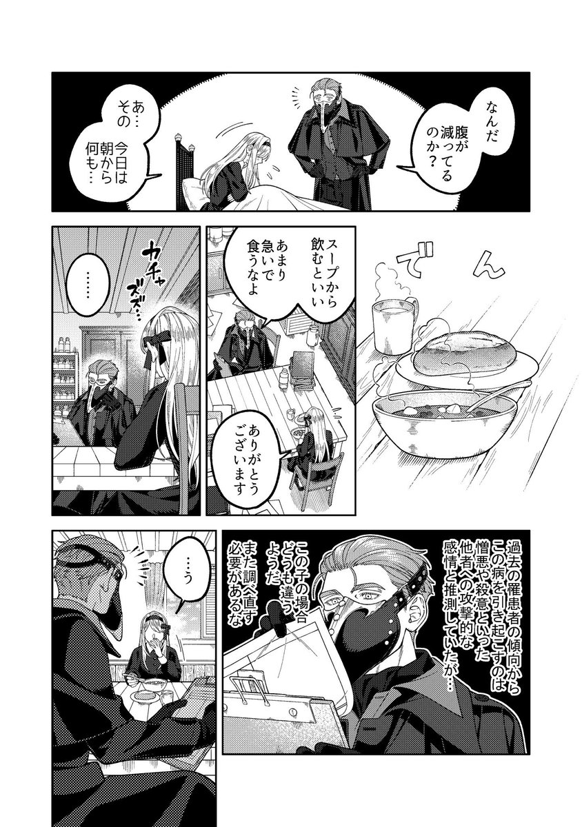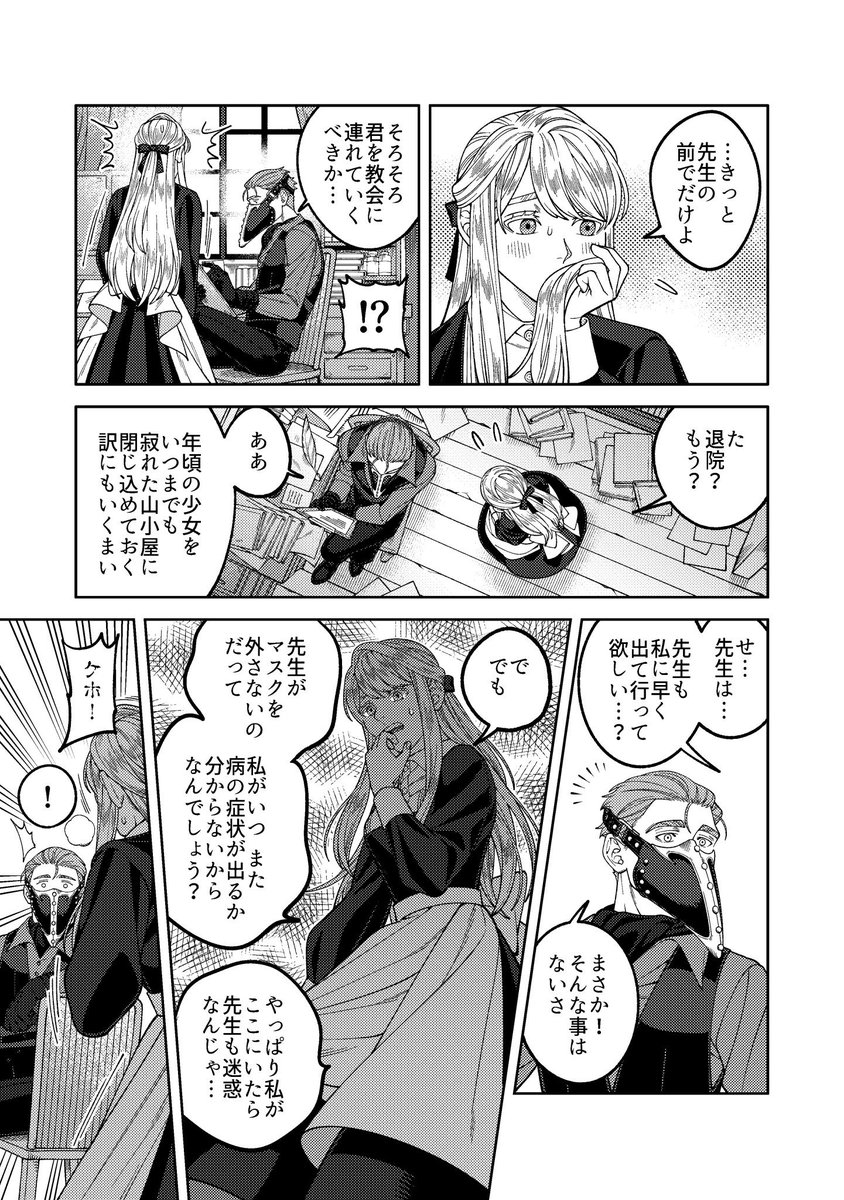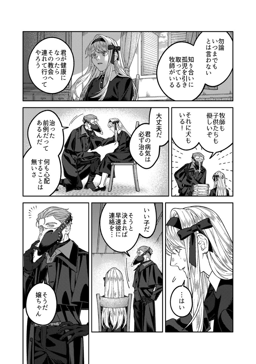 改めまして創作漫画の紹介を🙇♀️ 近代異国風の世界を舞台に、奇病を患った少女と怪しい医者のふたりが治療を通して過去と向き合う話です。漫画は固定ツイートか下記リンクから読めます。読んで頂けましたら嬉しいです…! pixiv.net/user/23236662/…