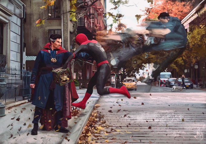 #SpiderManNoWayHome Decided to just complete this digital painting of this scene from the trailer I did months ago. Total of 5 hours to complete in Procreate. Will upload time-lapse of both sometime soon. Haven't watched the movie yet. Not sure if I get to though. twitter.com/sueannajoe_/st…