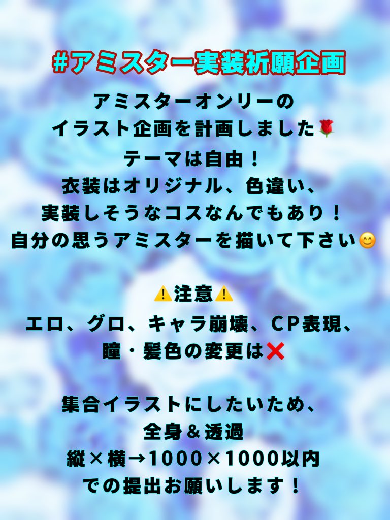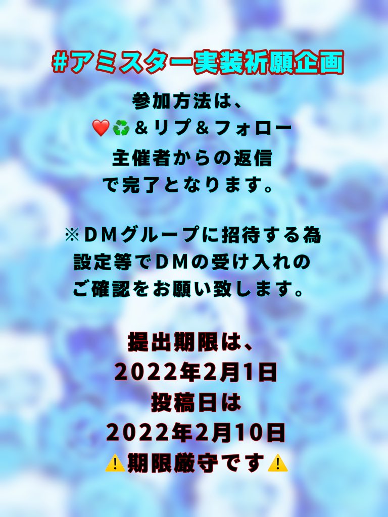 【⚠️拡散希望⚠️】 先日のコンパスフェスでアミスター実装情報が無く本当に残念に思いました。 そこで、 #アミスター実装祈願企画 アミスター実装を願ってイラスト企画を計画しました! 詳細は画像の説明をご確認お願いします。 たくさんのご参加お待ちしております✨
