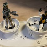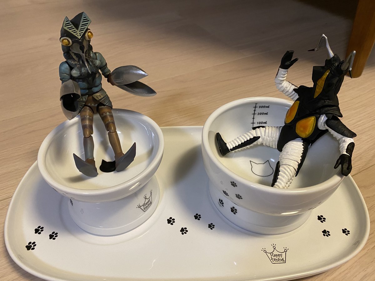 #夜のフィギュア撮影会 テーマ「今月のベストオモ写」 今月は猫を飼い始めたのと腰痛で、一眼レフを使ってマトモな撮影しておりませんです😓 来月は今月買ったフィギュアをいっぱい撮影しますぞ💪 (写真は猫のご飯容器セットでくつろぐバルタンさんとゼットンさん)