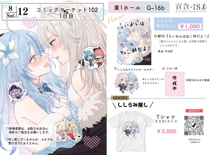 【C102お品書き】 💠夏コミ1日目 東1_G16b 「百合=18ℓ」 夏コミのおしながきです! 新刊セットやTシャツなどあります♌☃ 会場に来れない方はBOOTHでも通販あります⇒ suililac.booth.pm よろしくお願いします〜!