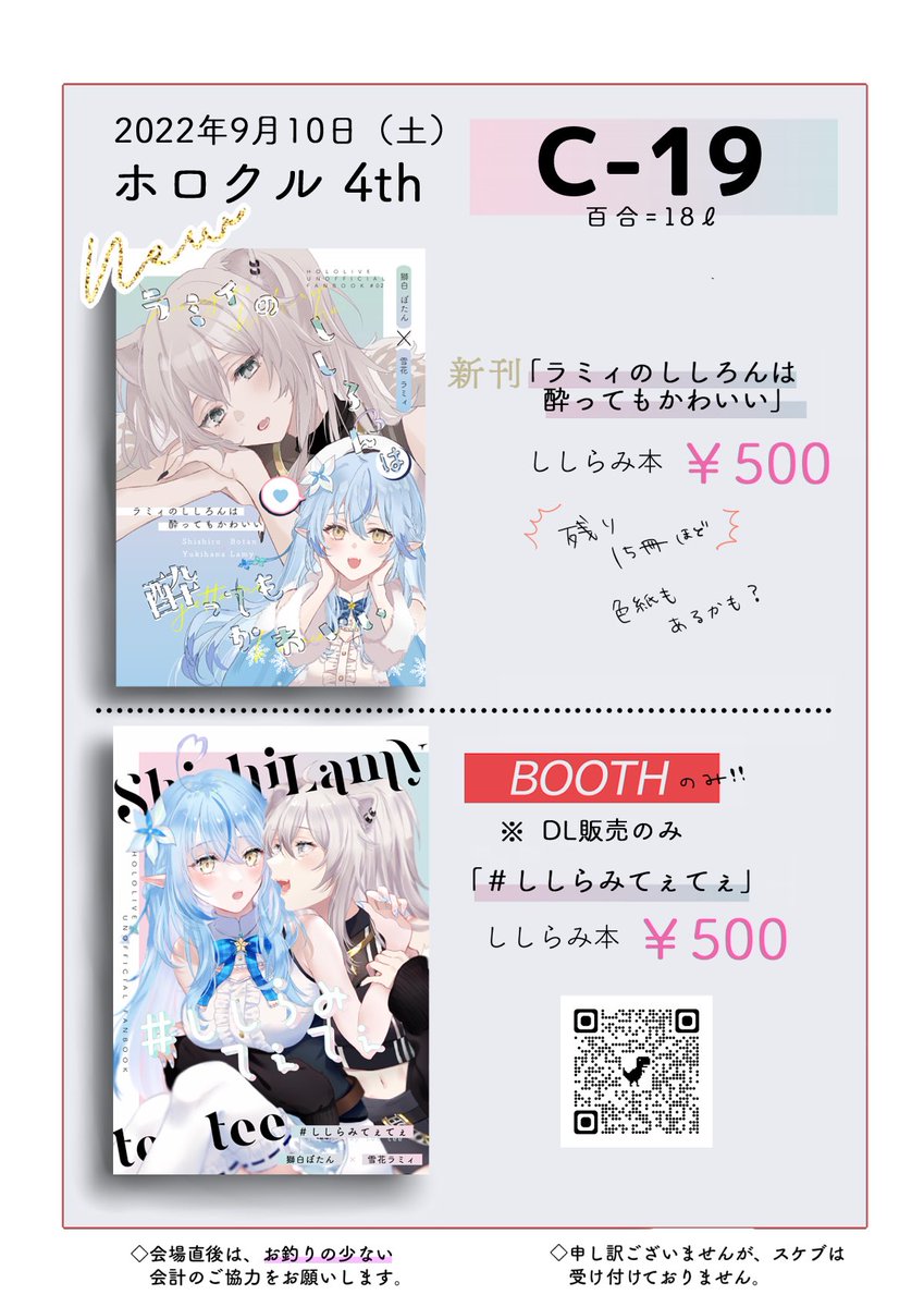 【ホロクル 4thお品書き】 💠9/10(土曜) C-19 「百合=18ℓ」 明日のホロクルのおしながきです 夏コミ新刊のししらみ本がわずかにあります! 色紙は作りました!! 既刊はBOOTHにあります⇒ suililac.booth.pm よろしくお願いします!