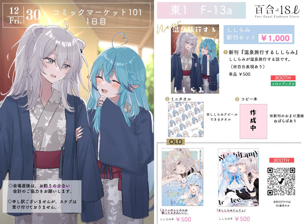 【C101お品書き】 💠12/30 1日目 東1_F13a 「百合=18ℓ」 冬コミのおしながきです! 新刊のししらみ本などあります🦁❄ 会場に来れない方はBOOTHでも通販あります⇒ suililac.booth.pm よろしくお願いします!