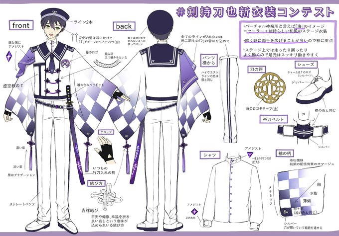 59 431 #剣持刀也新衣装コンテスト 3D衣装案です バーチャル神奈川と言えば海、+和服の融合 どんな曲を歌っても映える且つ動きやすくて16歳らしい華がある衣装を目指して描かせて頂きました! 21/06/08 00:07