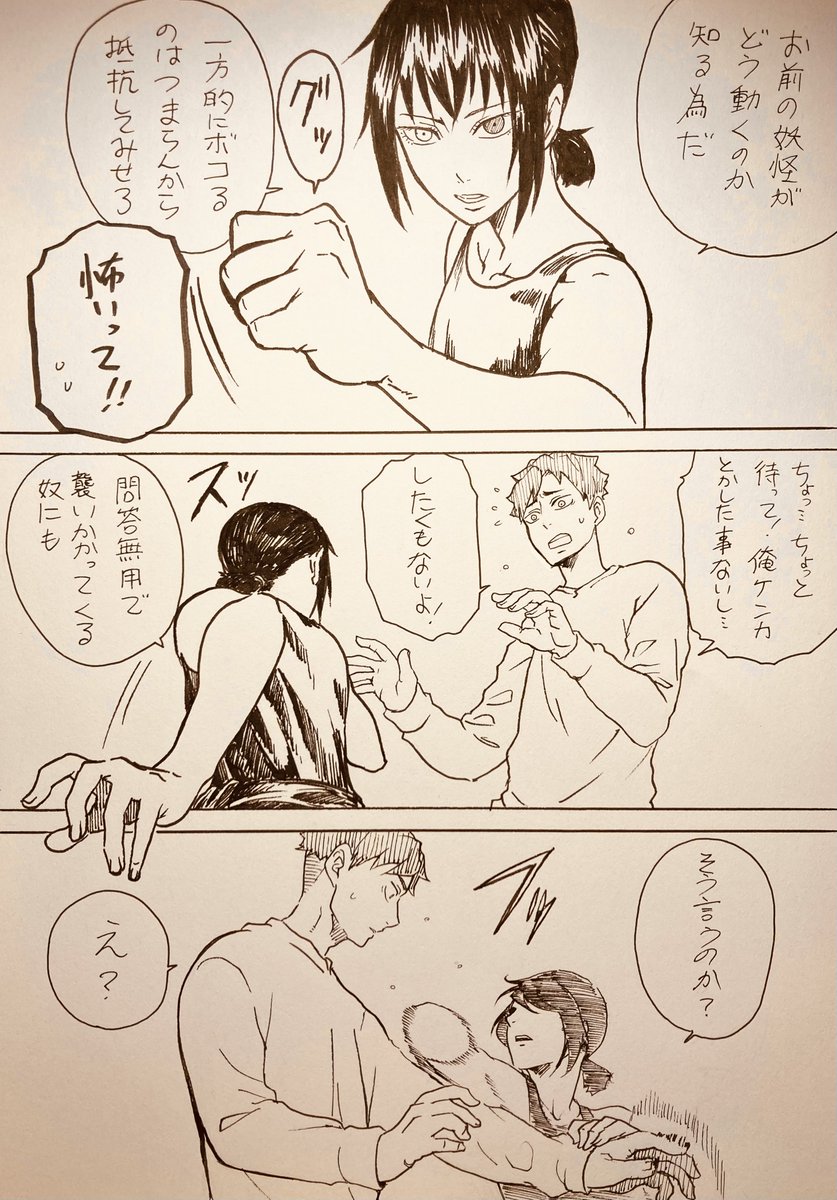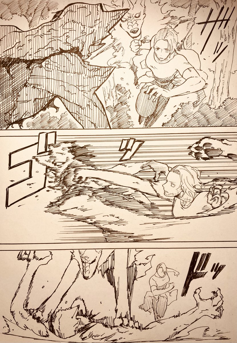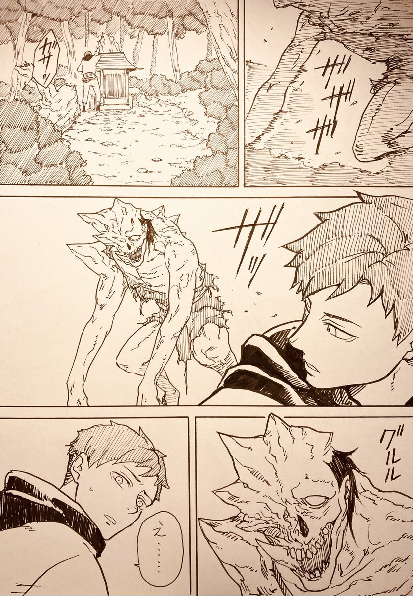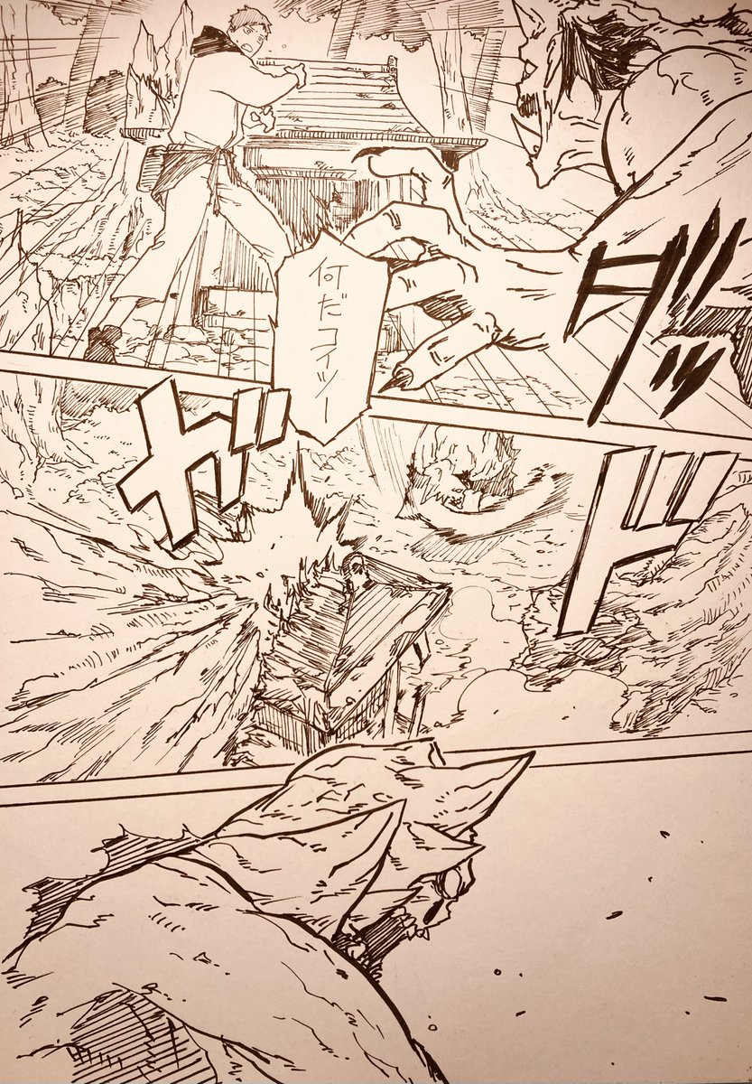 【オリジナル】妖怪ツキ 自分が読みたい漫画を描き殴ったアクション山盛り作品となっています。 全52ページの冒頭4ページです(続きはリプ欄のpixivへ)