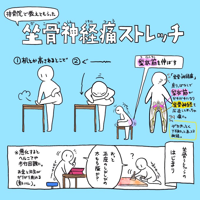 坐骨神経痛の時めちゃくちゃ良かった先生から教えてもらったストレッチ。 伸ばすとこは同じで座りながらとか寝っ転がりながらのバージョンもあるよ。 完治後も続けてるがマジで元気なので全てはお尻…。それか1時間毎に席立って踊るといいよ。