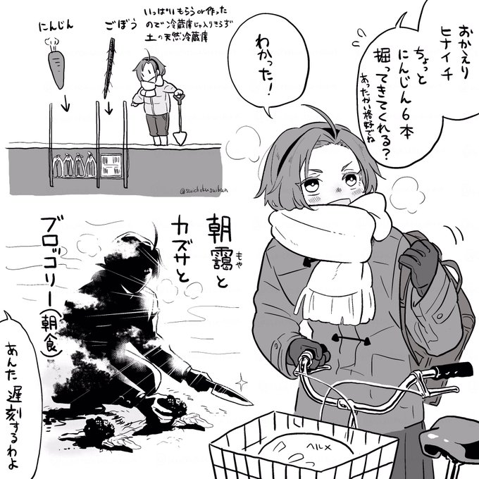 ヒナちゃの家は土地が広くてみんな当たり前に畑や菜園作る所なんだろうなぁ〜って思ってる。自分ちの敷地に川がある。 一族はこの後冷蔵庫の普及がはじまりノスになんて切り出すか会議してやっぱ暫くは氷室使う。 木下家は玄関に玉ねぎとバナナがある。