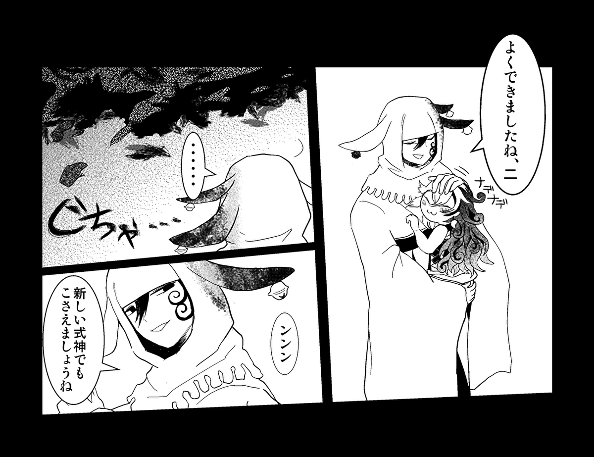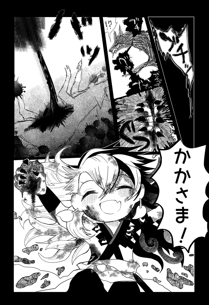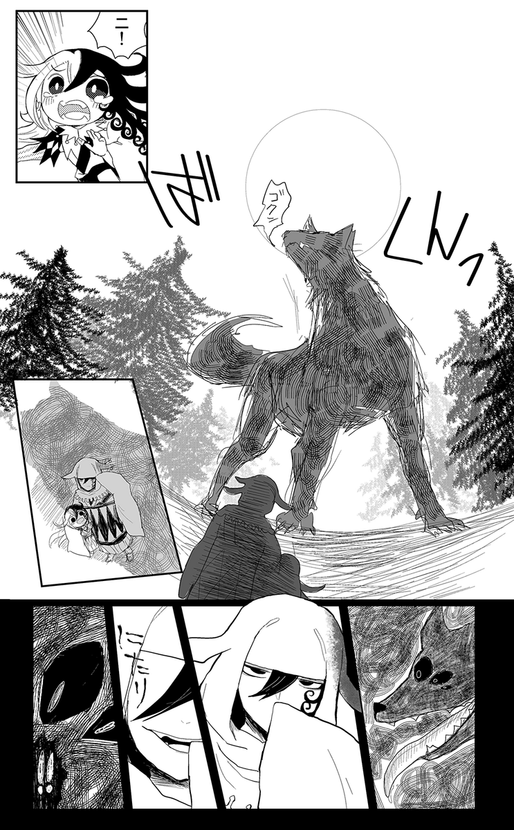 以前kaniさんがつぶやいてらした、「獣に食べられちゃった二ちゃんが獣のお腹の中から出てくるやつ」描きました。描けてるのかこれは? 突然始まり突然終わります。