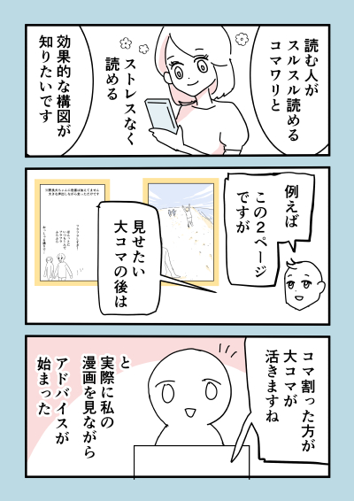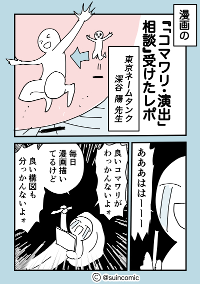 漫画の「コマワリ・演出相談」を受けてきましたレポ(1/2) (東京ネームタンク様@t_nametank 深谷陽先生) 毎日エッセイ漫画を描いてますが時間がなくてコマワリまで配慮出来てないのが悩みでした 「とりあえず状況が分かりように」から脱却したくプロに聞いちゃいました #漫画が読めるハッシュタグ