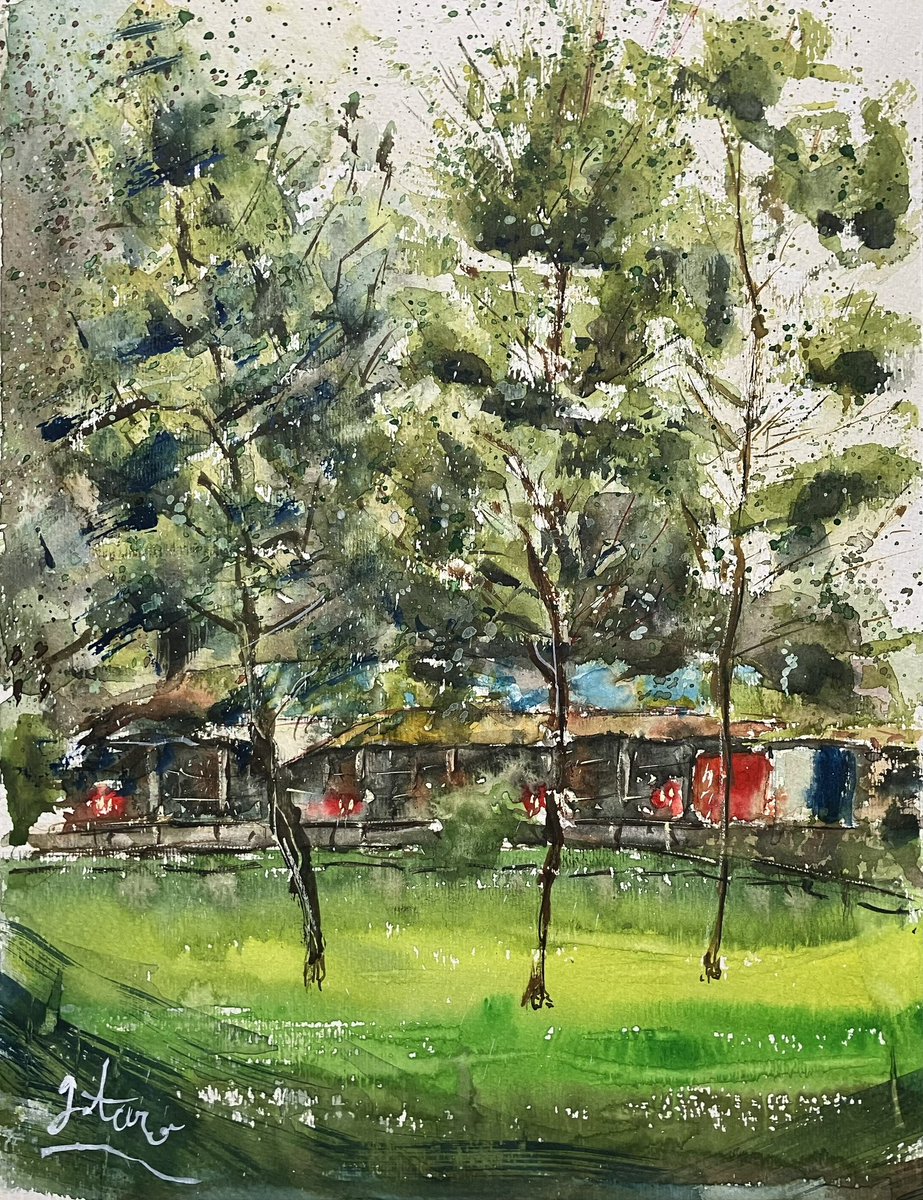 3 6 よく行く公園のカッコいい木とその向こうの売店 #絵 #水彩画 23/07/05 10:14