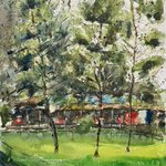 よく行く公園のカッコいい木と向こう側の売店の曇りの日 #絵 #水彩画