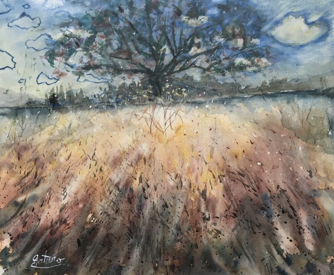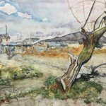 土手とその上のカッコいい木 #絵 #水彩画