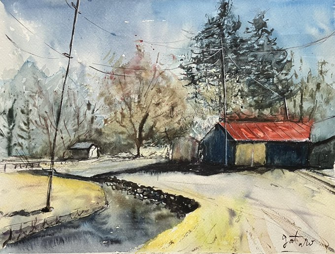 2 3 赤城山にある大沼のところのカッコいい納屋と川 #絵 #水彩画 23/06/07 07:18