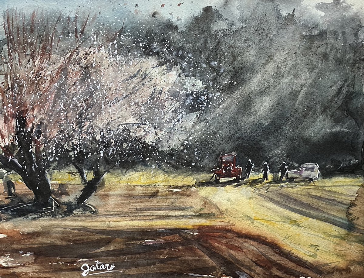 群馬県の高台のとこにある畑と光と梅の木 #絵 #水彩画