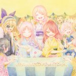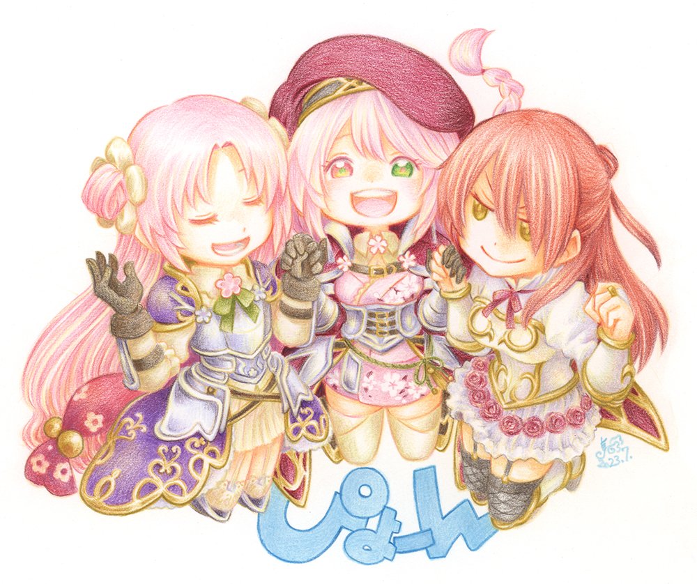 ぴょーんっとウメサクラバラ! スキャナで取り込み。 白紙部分切り抜きは後にしてもう1セット学生版も色着けしよう。この仲良しジャンプは他キャラでもやってみたいな。たいへんだけど。 #フラワーナイトガールイラスト
