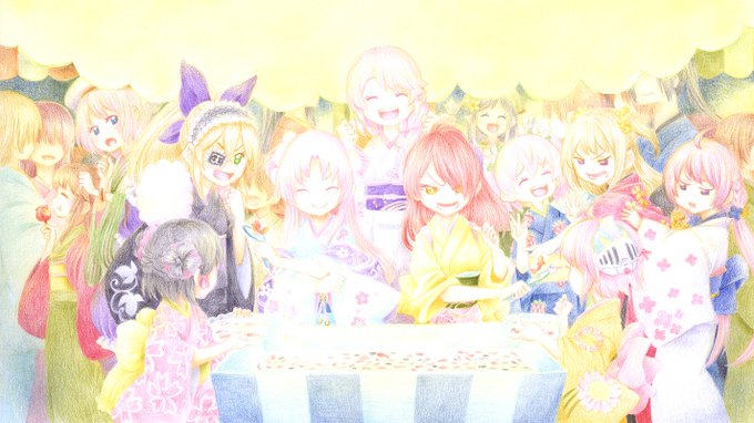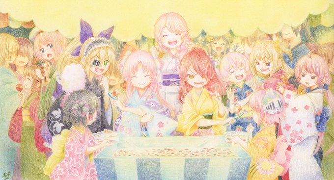 ベルガモットバレーのお祭り 色が結構飛んでるのでまた調整するかも。 #フラワーナイトガールイラスト ウメ、サクラ、カンヒザクラ、アイビー、バラ、ローダンセ、イチゴ、アブラナ、マルコミア、アーモンド、クルミ、オミナエシ