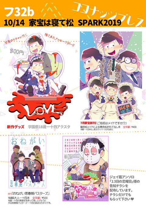 31 166 11月ぴかイチのスペース出てました!!【E40 ココナッツブレス】です💜💛💜💛スパークで出せなかった暖色メイドによる寒色松おもてなし(一十四メイン)本出すぞー!このメイドカフェは三色団子も出るよ🍡💜💛 19/10/18 18:28