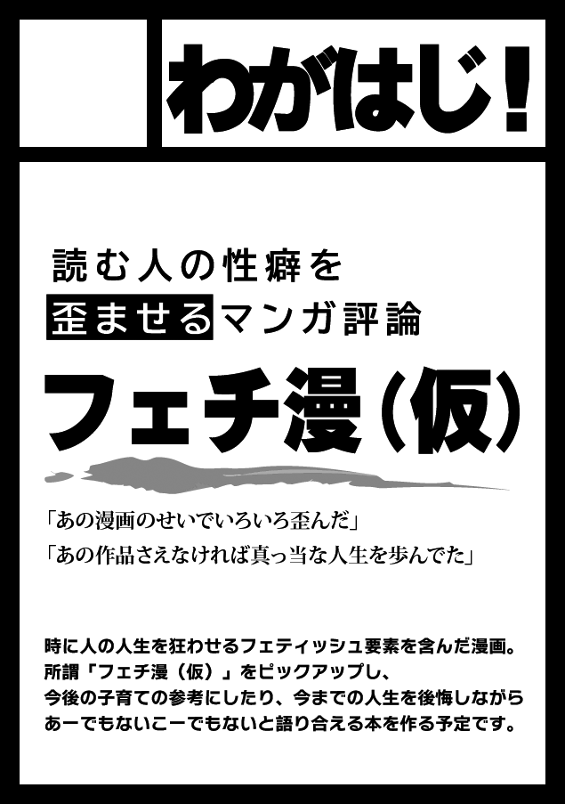 あなたのサークル「わがはじ!」はコミックマーケット101で「土曜日東地区 "ヘ "28b」に配置されました!コミケWebカタログにてサークル情報ページ公開中! webcatalog.circle.ms/Perma/Circle/1… #C101WebCatalog てことで先日アンケートの通り「フェチ漫!貴方の性癖をねじ曲げたマンガレビュー」出ます!多分。