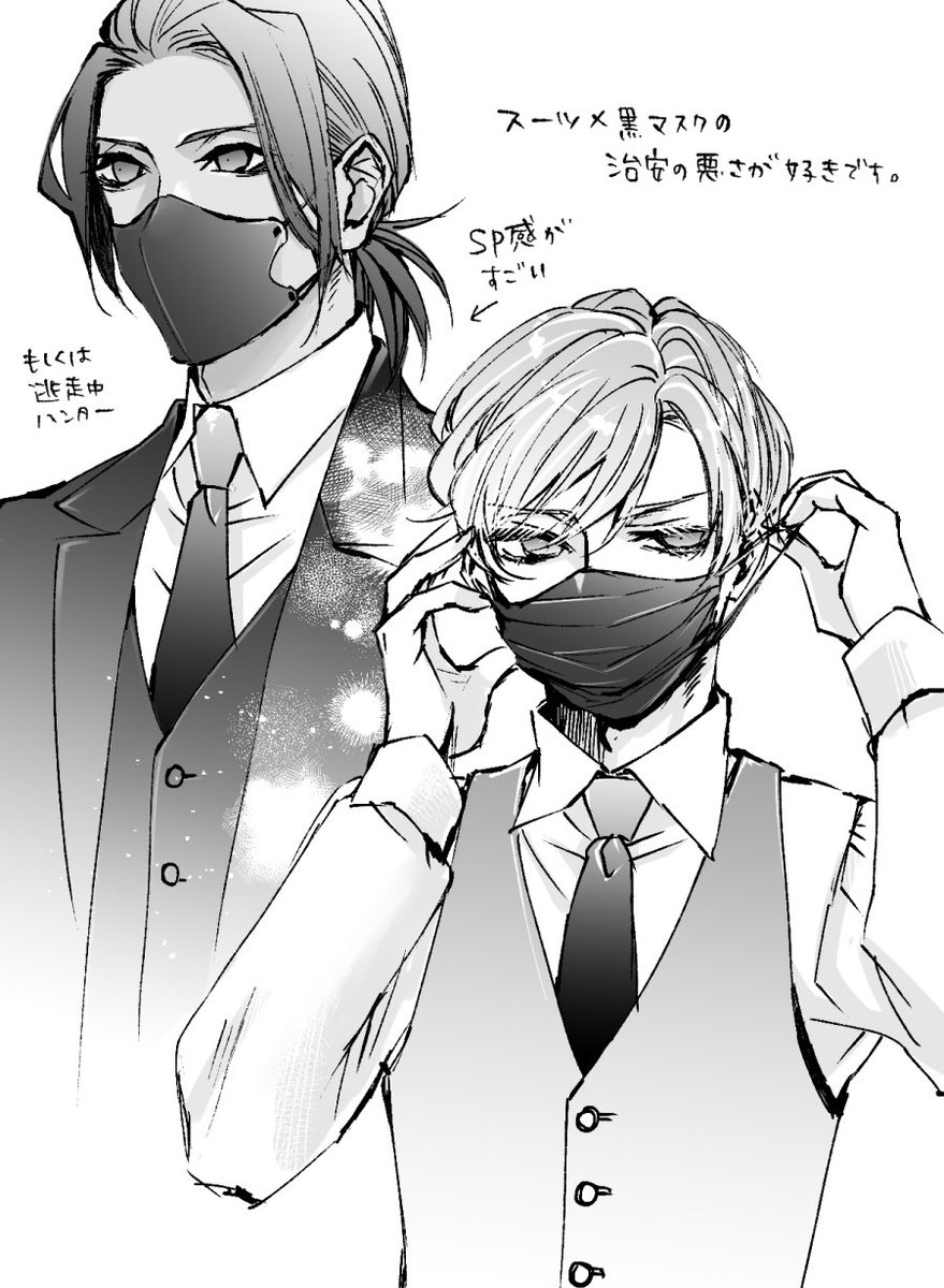 らくがき。 もちろん白も好きです。 マスク×スーツいいですよね。 スーツならなんでも良いんですけど。