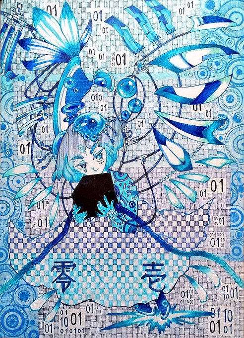 #青い画像で涼を感じよう 「零と壱の支配者」 B4サイズ アナログ絵でデジタルな世界観を描きたくて頑張った作品🟦⬛🟦 電脳世界の天使と、パパ•ブラックボックス。 #イラスト好きさんと繋がりたい #絵柄が好みって人にフォローされたい #イラスト #アナログイラスト