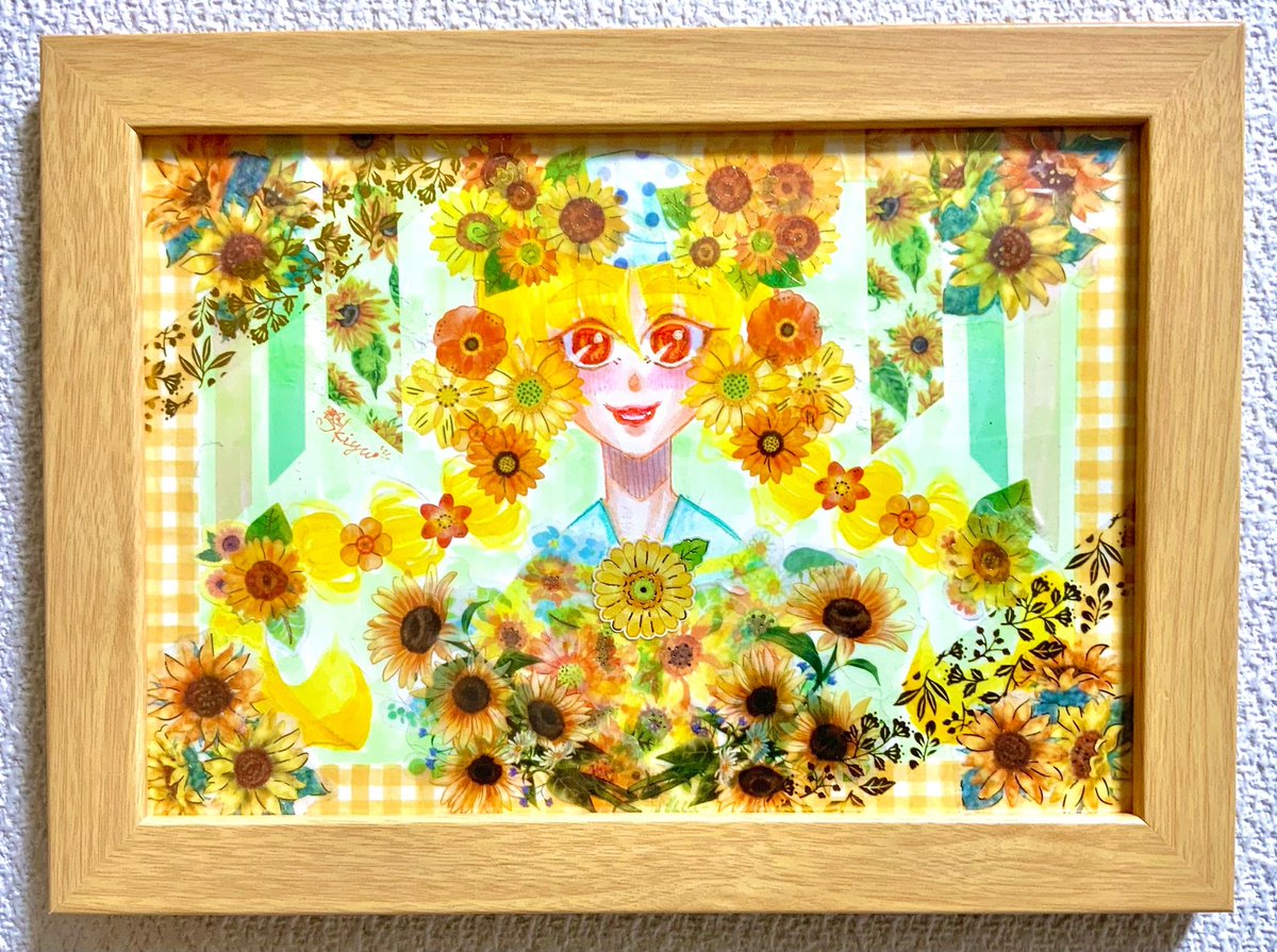 額に入れてみました🌻🌻🌻 「向日葵の祝福」 A5サイズ これでもかと向日葵を入れ込んでおります! 夏の乙女✨ #イラスト #アナログイラスト #アナログ絵 #イラスト好きな人と繋がりたい #夏休みはフォロワーが増えるらしい #絵柄が好みっていう人にフォローされたい #夏の創作クラスタフォロー祭り