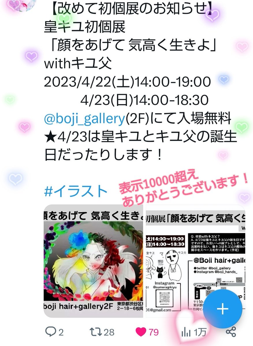 な、なんと!初個展前から初めての経験をさせて頂いております! 祝!表示1万超え! ありがとうございますー🌸 う、嬉しい( ;∀;)💕✨✨ #個展 #アナログ絵 #イラスト #イラスト好きな人と繋がりたい #絵描きさんと繋がりたい