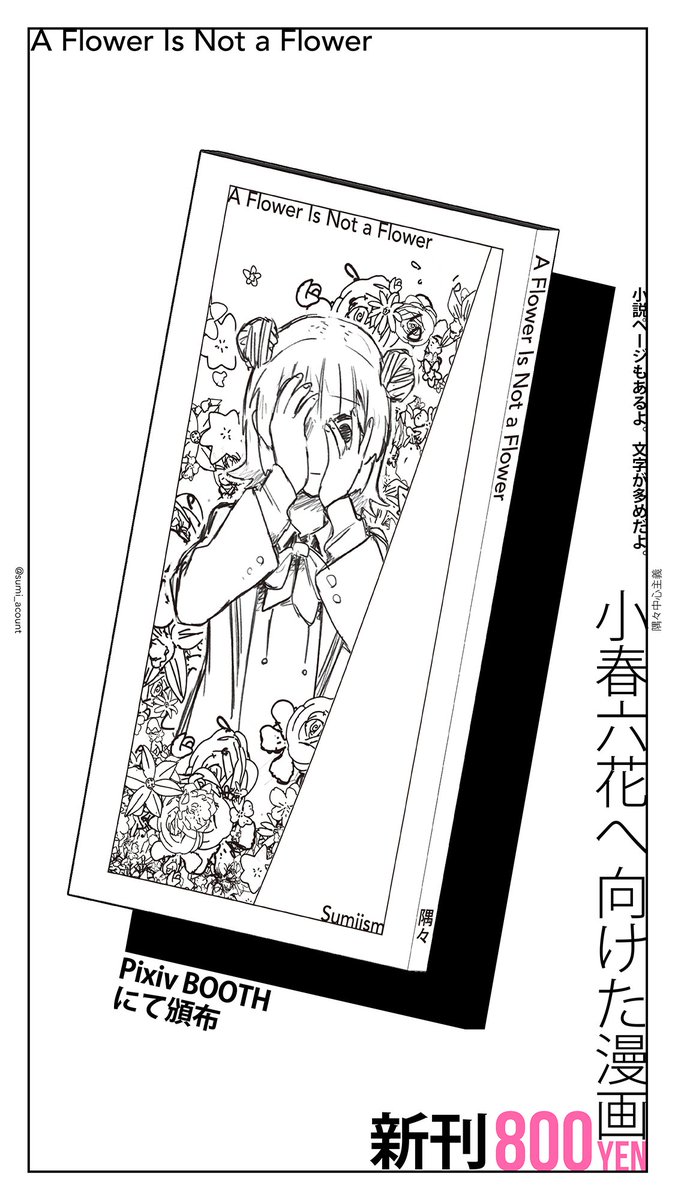 【告知】 『A Flower Is Not A Flower』 漫画、出します。 小春六花と夏色花梨と花隈千冬。 冬空のような薄暗いお話です。 真っ白な漫画です。 縦長漫画です。 文字多めで、小説ページもあります。 おまけ本8Pもあります。 800円。 よろしくお願い致します。 ↓BOOTH sumiism.booth.pm/items/3753976