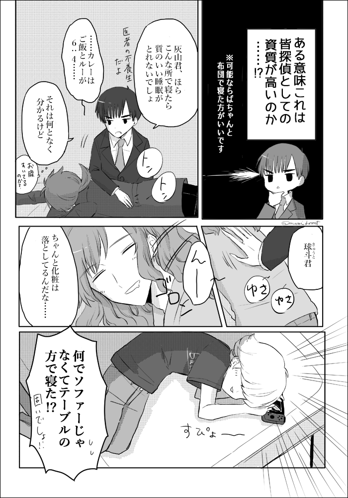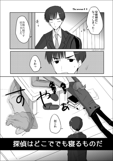 3 11 「探偵はどこででも寝るものだ」1/2 どこでも眠れる人は探偵に向いているらしいです (今回の話は皆さんお疲れです) #漫画が読めるハッシュタグ #創作漫画 #GIN探偵事務所 22/10/01 20:00