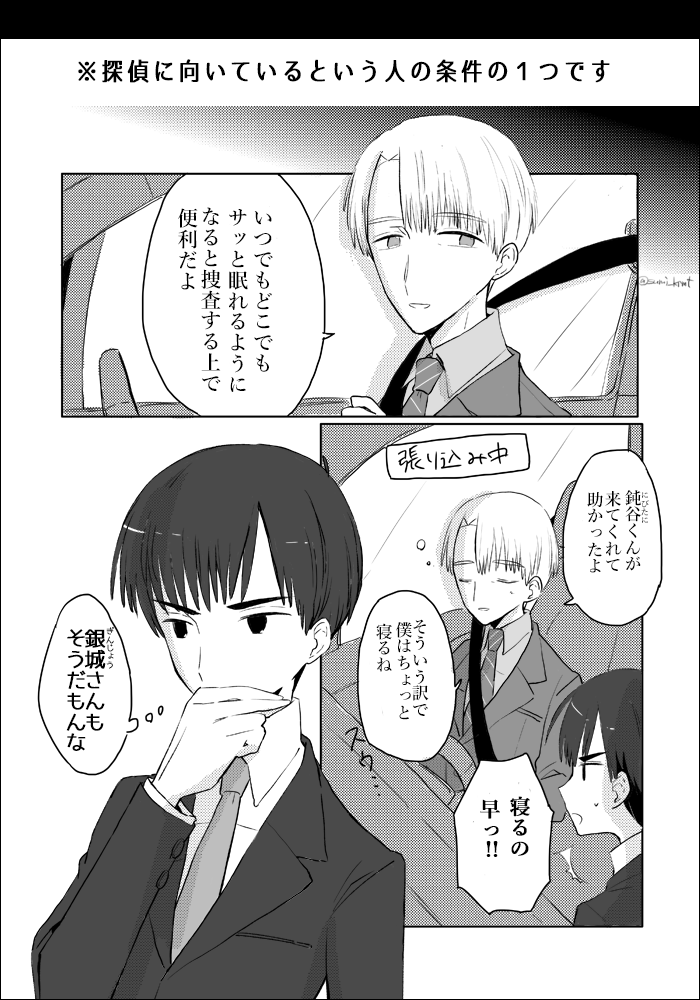 「探偵はどこででも寝るものだ」1/2 どこでも眠れる人は探偵に向いているらしいです (今回の話は皆さんお疲れです) #漫画が読めるハッシュタグ #創作漫画 #GIN探偵事務所