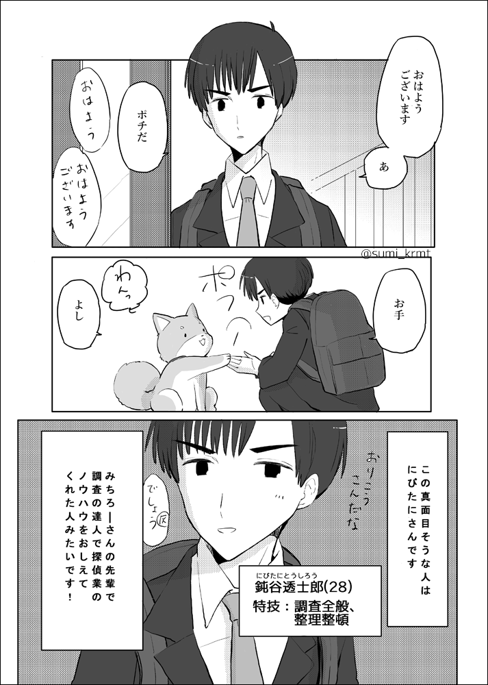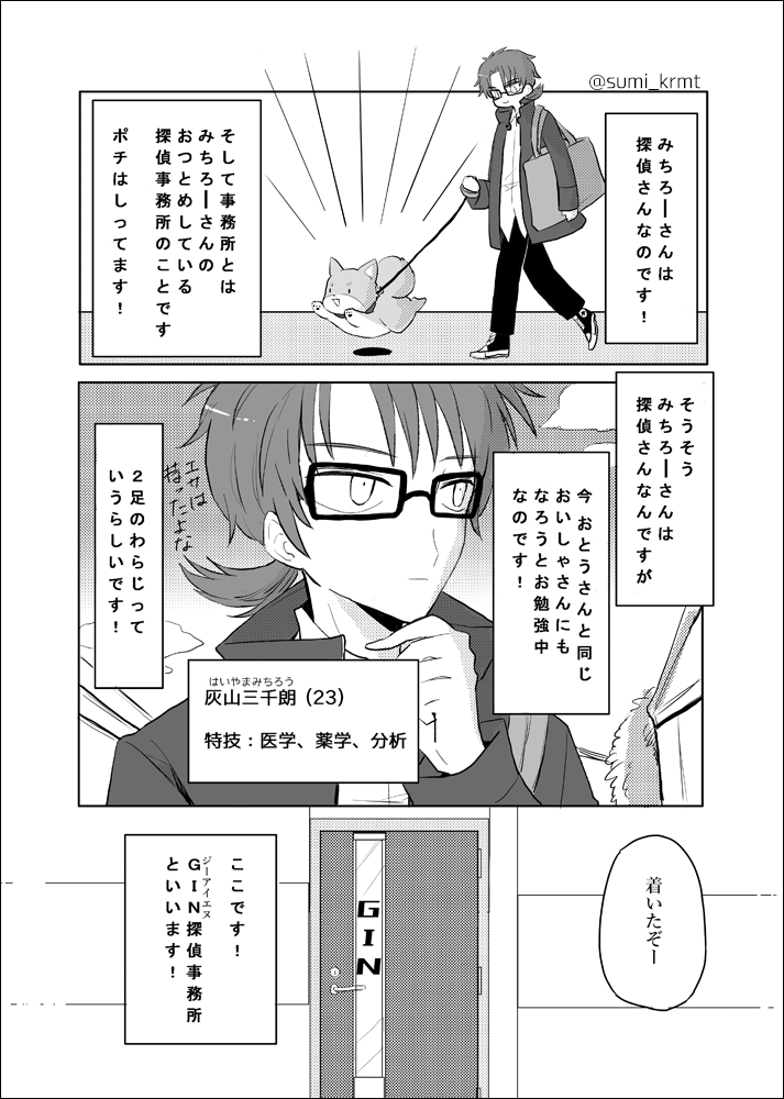 4 17 柴犬ポチから見た、GIN探偵事務所メンバー紹介漫画です。1/2 #漫画が読めるハッシュタグ #創作漫画 #GIN探偵事務所 22/10/21 20:00