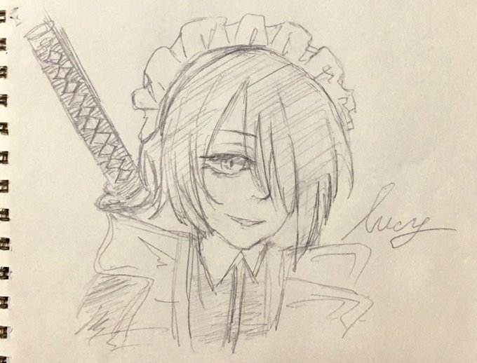 ルーシーこれで勤務歴が1番長いの反則だよねって思いながら落描きしてた 4人の中で唯一刀という武器を持ってるし、表現しきれなかったけどロリなんですよ…… #メイドインザダーク #落描き 片目隠さないで胸がドキドキしちゃう