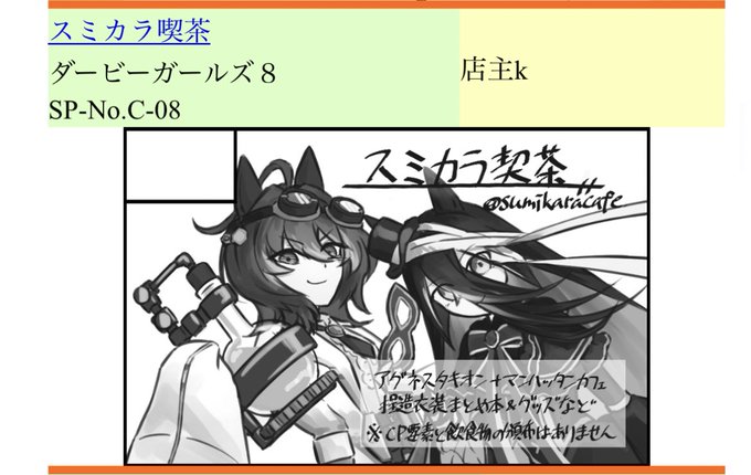 4/16のダービーガールズ8(京都)のスペースNoが出てたみたいです、 【C-08 スミカラ喫茶】になります。とりあえず画像2枚目のものと、間に合えばイラストまとめ本とクリアファイルを持っていく予定です。地方になりますが宜しくお願いします。