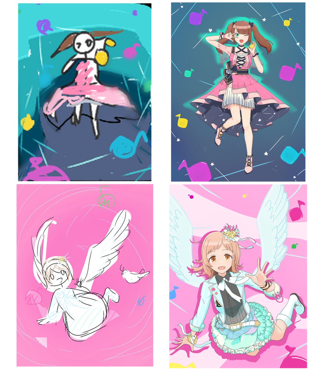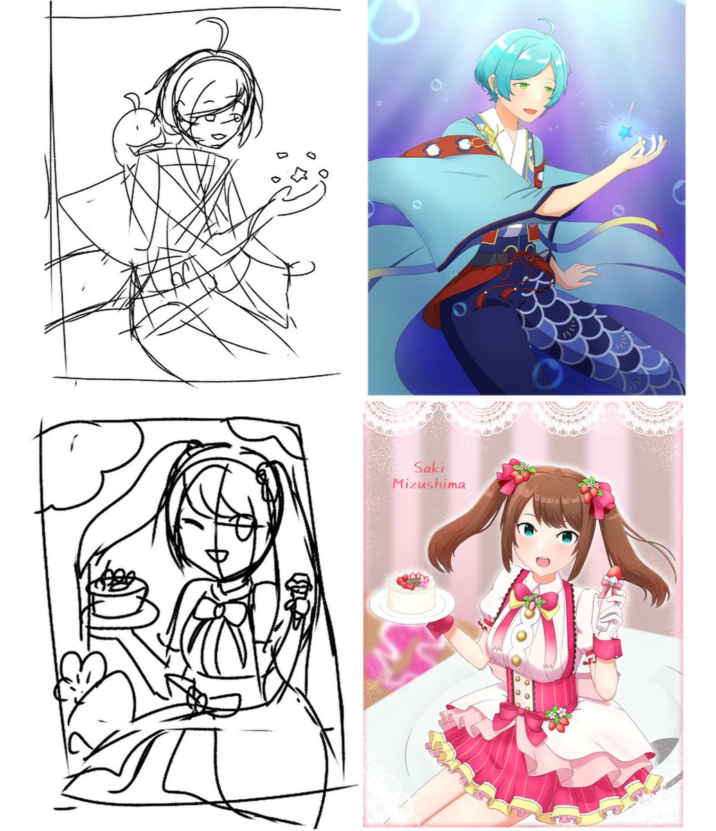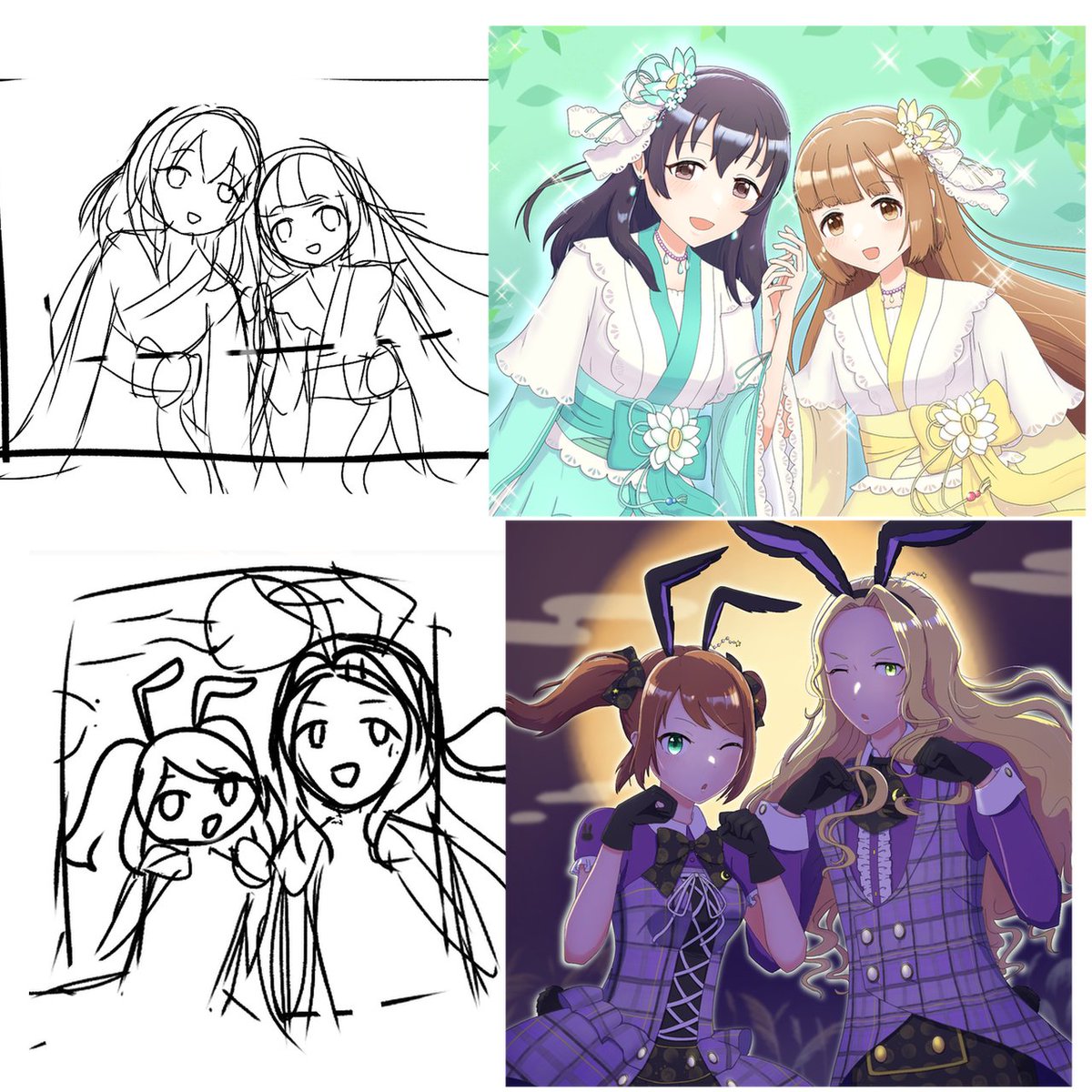 #このタグを見た人はラフ画とその完成絵を見せる (チェンメみたいな意味じゃないけど) ラフ……の前の大ラフ(案)段階 大ラフ見てるとデフォルメ絵にしても良い気がする デフォルメも練習したいな