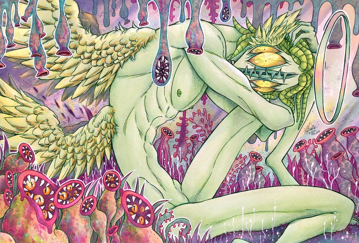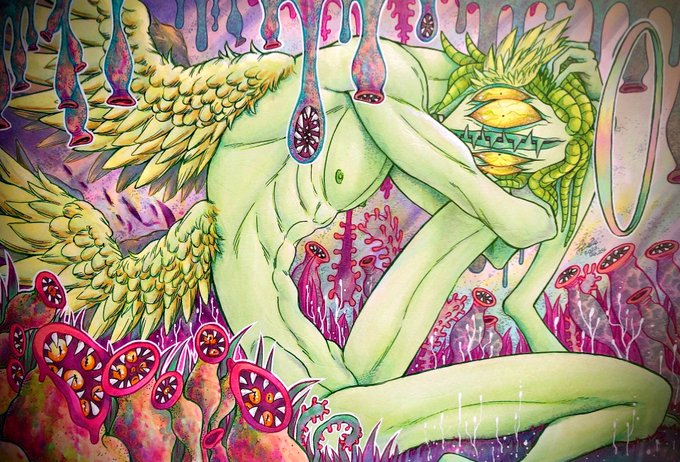【シートッド】嫉妬を司る天使です。 何でもかんでも嫉妬をする為、常に無関心のフリをしています。視線を感じたらシートッドからヤキモチを妬かれている可能性が高いです。 (お口のデザインは初描きの絵から少し変えて、ハエトリグサのような噛み合わせの唇にしました。) #聖唇天使 #シートッド