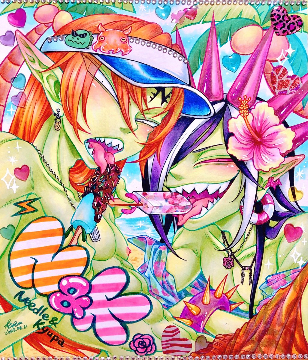 常夏N&K🏝️🌺💕✨/by2023.06.11(完成) グリーンなお肌で弄ぶ夏…🖤🩷🩵 #創作 #アナログ #コピック #ゲス悪魔 #ゲス悪魔ニードル #ゲス悪魔キュパ