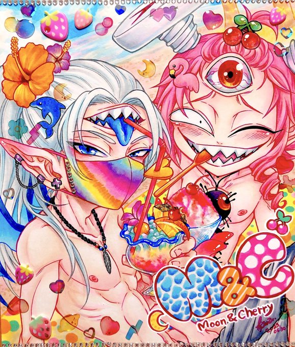 常夏M&C🌺🍹🍧✨/by2023.06.30(完成) 陽気な悪魔達の夏休み☀️✨ #創作 #アナログ #コピック #ゲス悪魔 #ゲス悪魔ムーン #ゲス悪魔チェリー