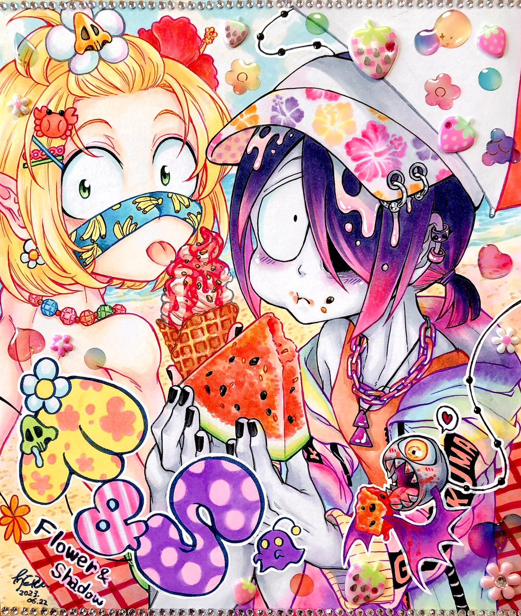 常夏F&S 🏝️🍉🍨✨/by2023.06.22(完成) 真夏の海を満喫したいボクら #創作 #コピック #アナログ #ゲス悪魔 #ゲス悪魔フラワー #ゲス悪魔シャドー