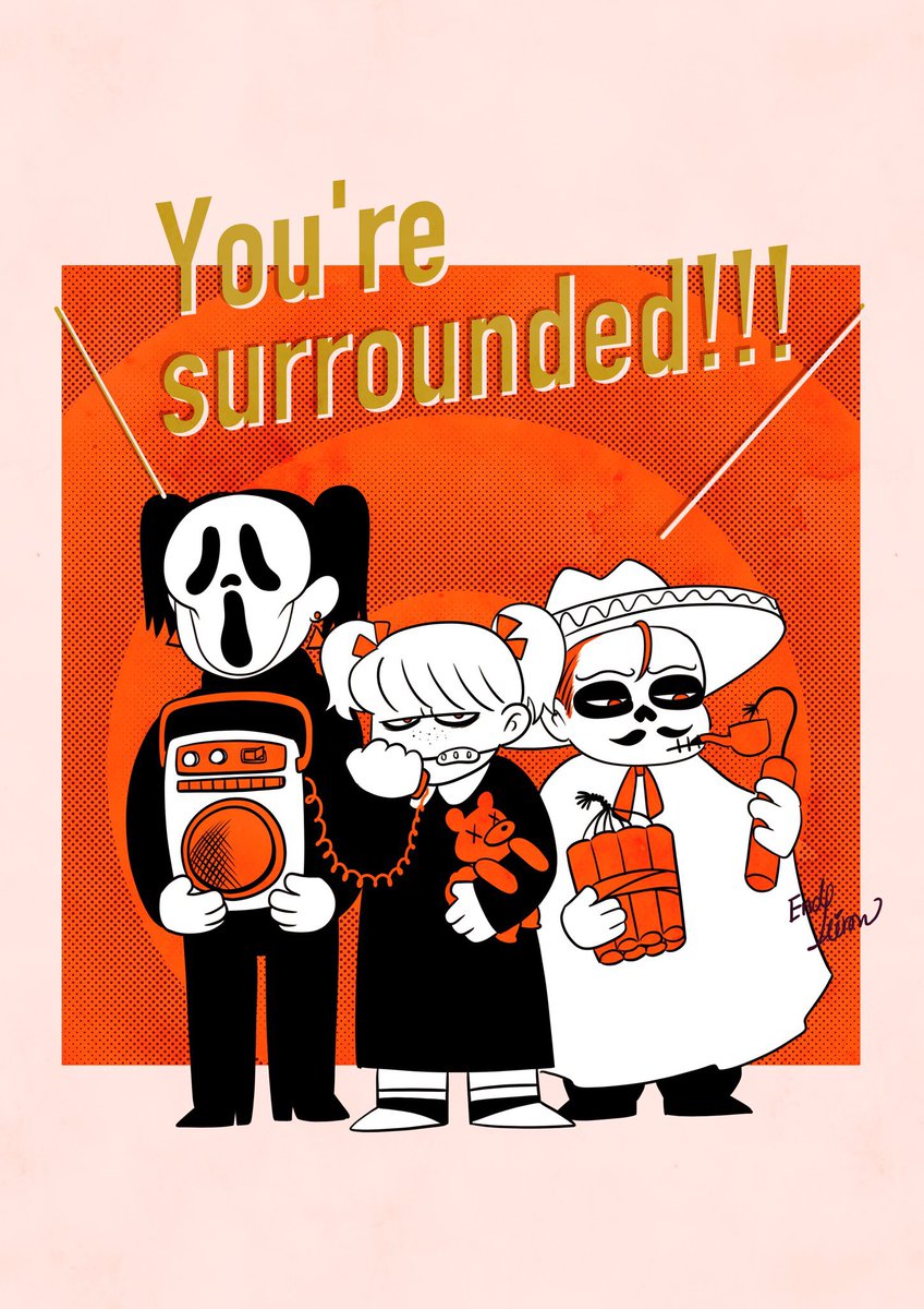 お前は包囲されている! 早く降伏しろ!さもなくば突入する! ケチで名高いおじちゃんの家を囲んでいる緊迫したキッズ達🎃👻 #ハロウィンイラスト展示会2022 #ハロウィンイラスト2022 #秋の創作クラスタフォロー祭り