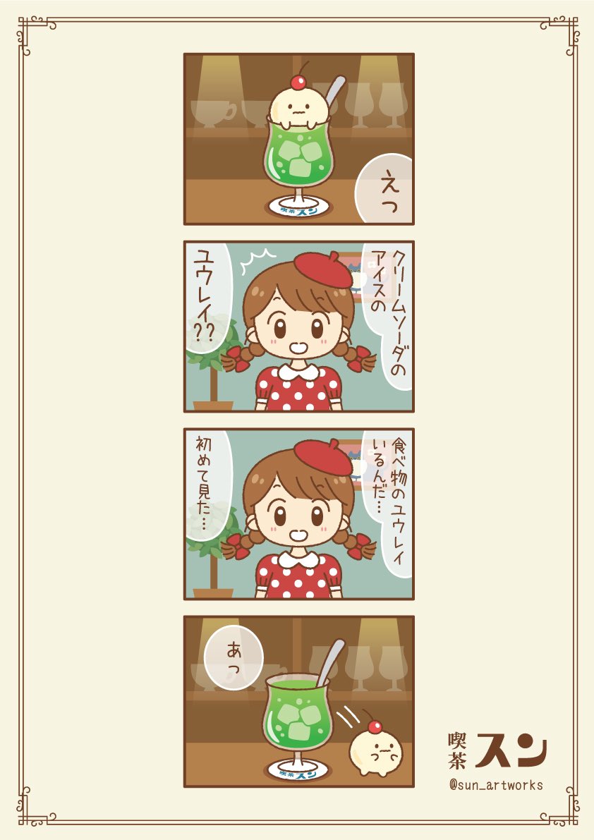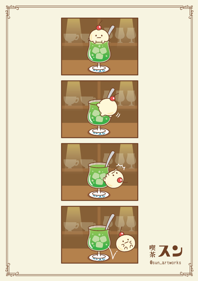 18 35 とある喫茶店に住んでいるクリームソーダのアイスのおばけ🍒 #イラスト #オリジナル #創作 #illustraion #漫画が読めるハッシュタグ #4コマ漫画 22/03/28 20:25