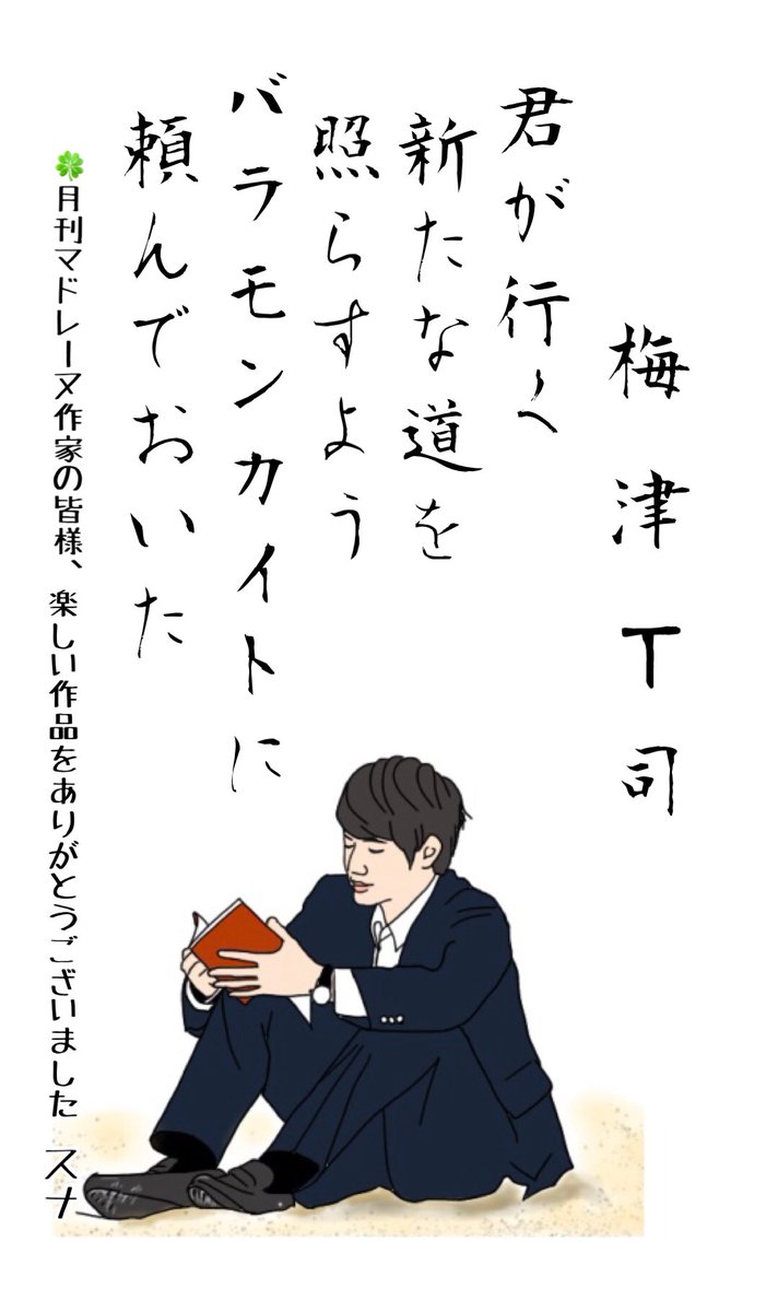 先日参加させていただいた「月刊マドレーヌ」。作家様限定で『幸運のバラモンカイト3点セット』と梅津T司先生による短歌カードを贈らさせていただきました😌 本編の貴司の短歌と違って、T司先生のバラモンカイトへの信頼と他力本願ぶりが熱いです☺️申し訳ない #舞いあがれ絵 twitter.com/ocho_iroiro/st…