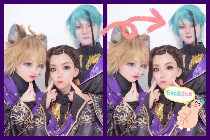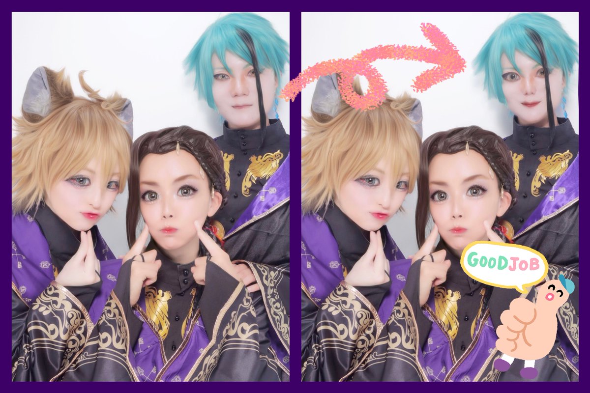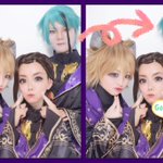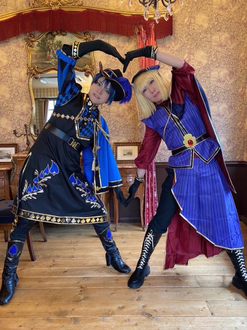 振り幅見て🤭 🏹と一緒にハート作ってはどうかと提案してくれた🍎さんきゅー❣️ 速攻で撮ってもらった😘 #twstコスプレ 🏹@msmn ♠️ヨウ 📷@ogrengrey 🍎 twitter.com/sunny926cos/st…