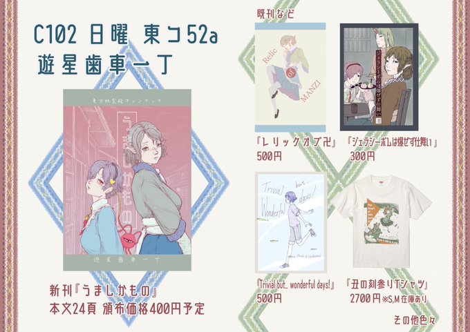 あなたのサークル「遊星歯車一丁」は、コミックマーケット102で「日曜日 東地区 “コ” ブロック 52a」に配置されました!コミケWebカタログにてサークル情報ページ公開中です! webcatalog.circle.ms/Circle/Map/173… #C102WebCatalog 今年も夏がやってくる…🌞