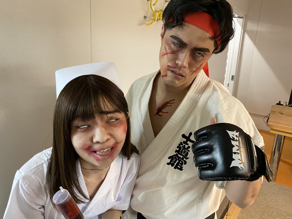 4 11 本日もこんな2人ですが、 一応RADIOの生放送なうです。 #ハロウィン #仮装 #コスプレ #スト2 #リュウ #ナース #ゾンビ #宮崎 #ラジオ #公開生放送 20/10/29 16:35