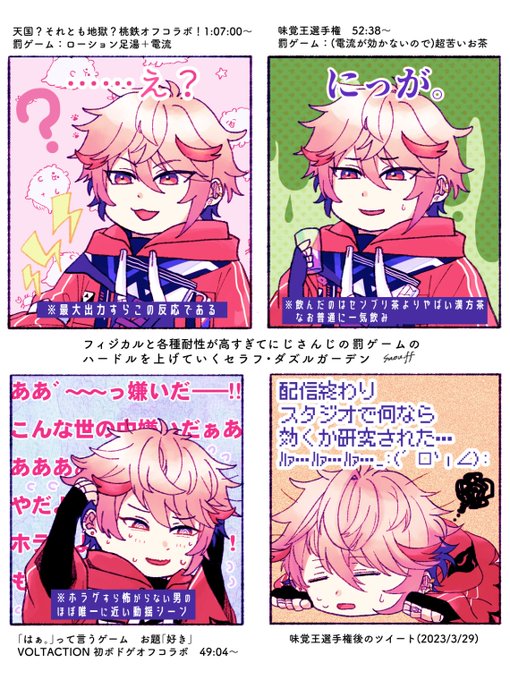41 148 VOLTACTIONオフコラボが増えていくたび、何故か罰ゲームじゃないボドゲコラボが一番本人にダメージが入ってる事実に重みが増してきて味わい深い。 味覚王の後一体何をスタッフさんに実験されたのか、今後が楽しみです。味覚(辛・苦)、痛覚以外にいったいどんな罰ゲームストックが……? #SeraPic 23/04/06 21:37