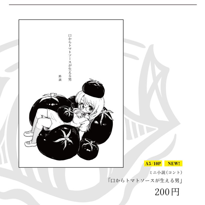 5/5 comitia144で、コントの台本みたいな、小説みたいな、謎の本を描きました。10pで3500字前後です。 『口からトマトソースが生える男』と言います。 200円のコピ本です。 表紙イラストは、業堀 (gohori @SagafroKichigai )さんにお願いしました。 #comitia144 #コミティア144