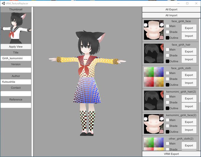 あ~こりゃいいわ。自作でも、セシル変身製でも、他の人が作成して公開してるVRMでも、テクスチャのエクスポートと書き換えができる。 VRMテクスチャ差し替えるやつ | 120byte 120byte.booth.pm/items/2177538 #booth_pm