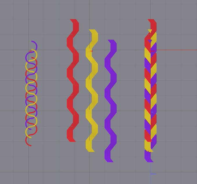 まーいっぺん引用RTで。 三つ編みってモデリングするとき、これどうなってんの?って思う謎のひとつ。パターン化できたらいいねって思ったりも。 で、構造解説の画像を精査していたら、これは三相交流波形では?と気づいた。 試行錯誤してみたら、ホントに三相交流波形だった! という、お話。 twitter.com/super_sierra/s…