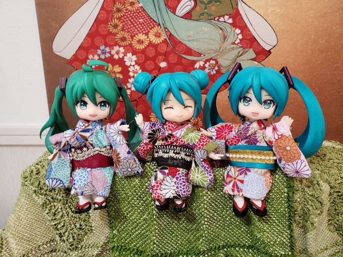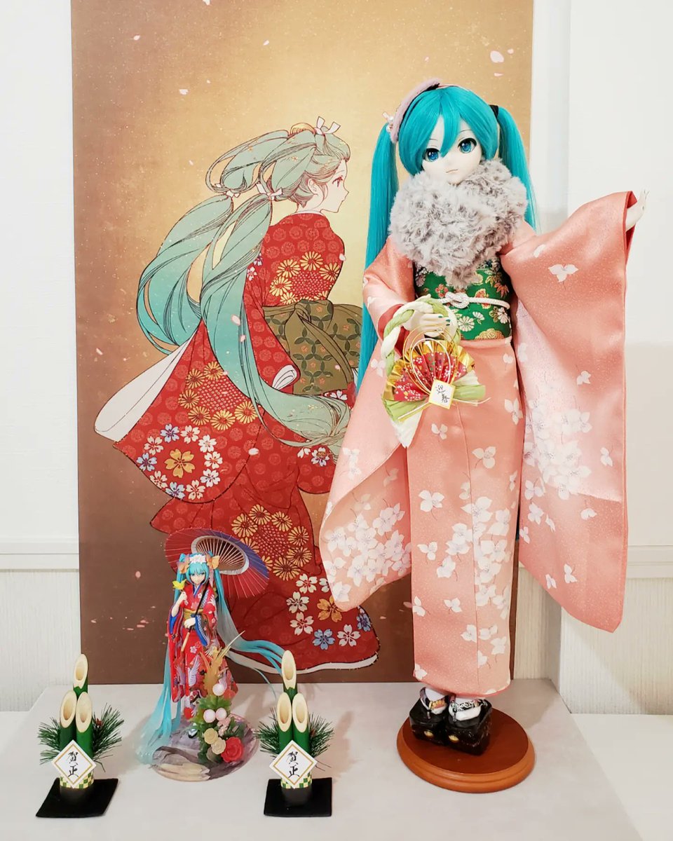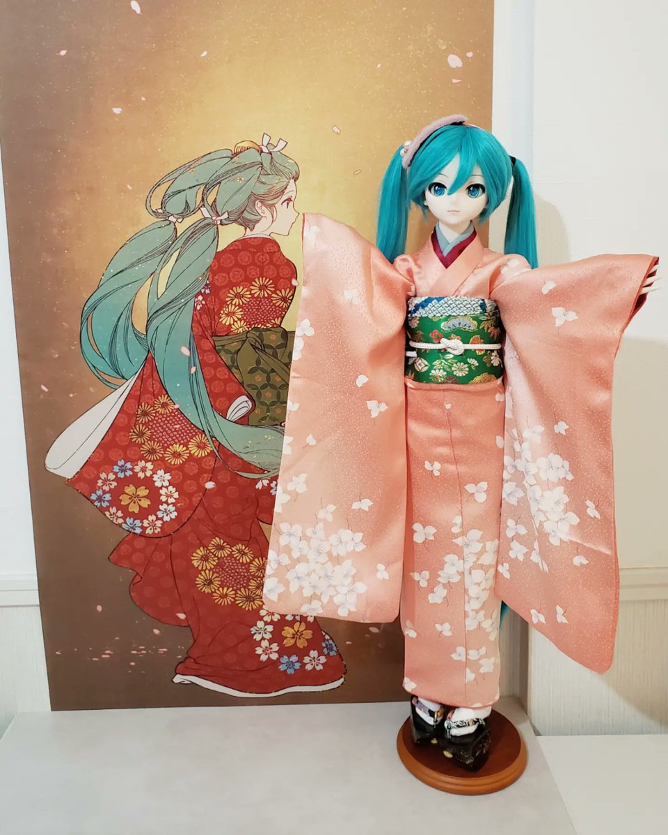 1/1のお題【フリー】 新年のご挨拶🎍 もう着ない訪問着を解体して、ミクさん用の振袖を仕立てました。初めてにしては模様配置も可愛くできた気がする! 和服ミクさんがずっと憧れだったので、我が子の晴れ姿に感涙です( ߹꒳߹ ) #深夜の初音ミク撮影60分一本勝負