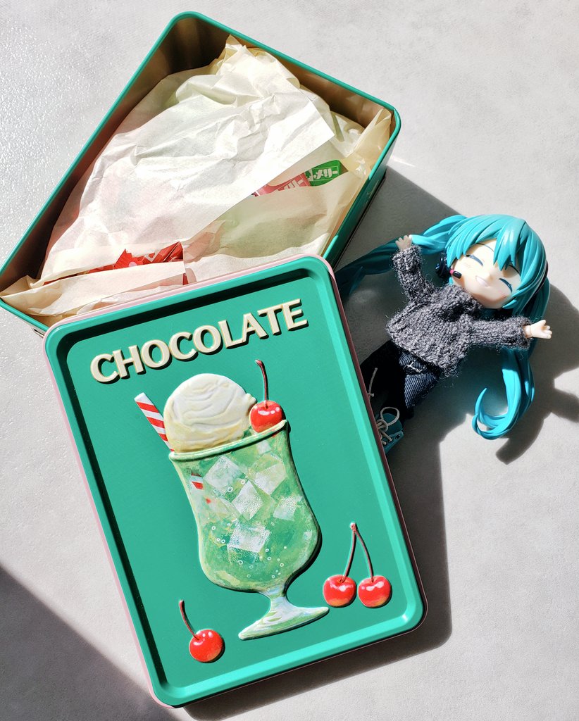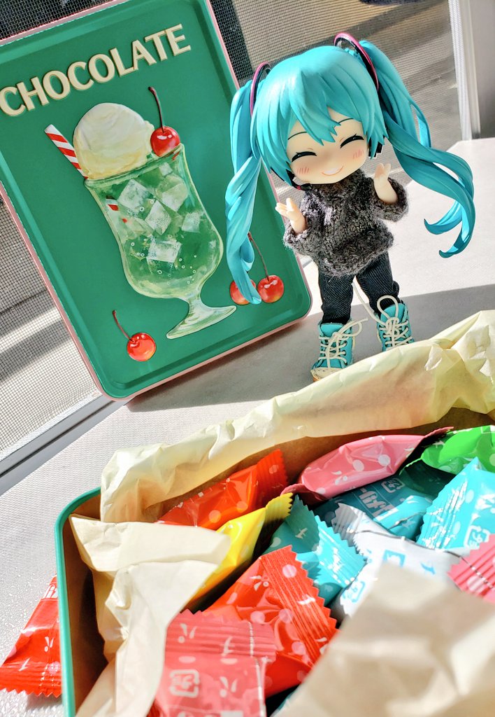 2/14のお題 【ばれんたいんでー】【チョコレート】 メリーチョコのカンカンがすごく可愛くて 中身もカラフル🌈 一緒に食べようね(˶ˊᵕˋ˵) #深夜のねんどろ撮影60分一本勝負 #深夜の初音ミク撮影60分一本勝負